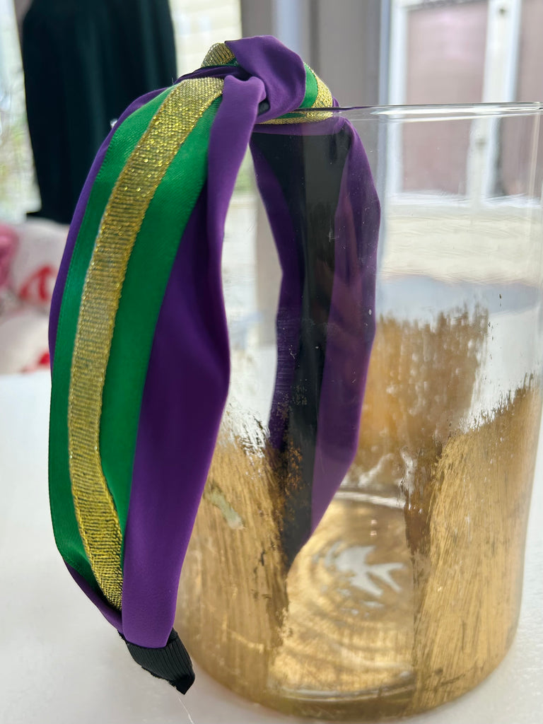 This is a purple headband wrapped in a green ribbon, with a smaller golden glitter ribbon on top of that. It is a fun, yet elegant choice for those going for a more chic festival look.