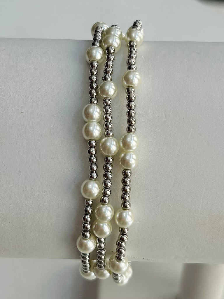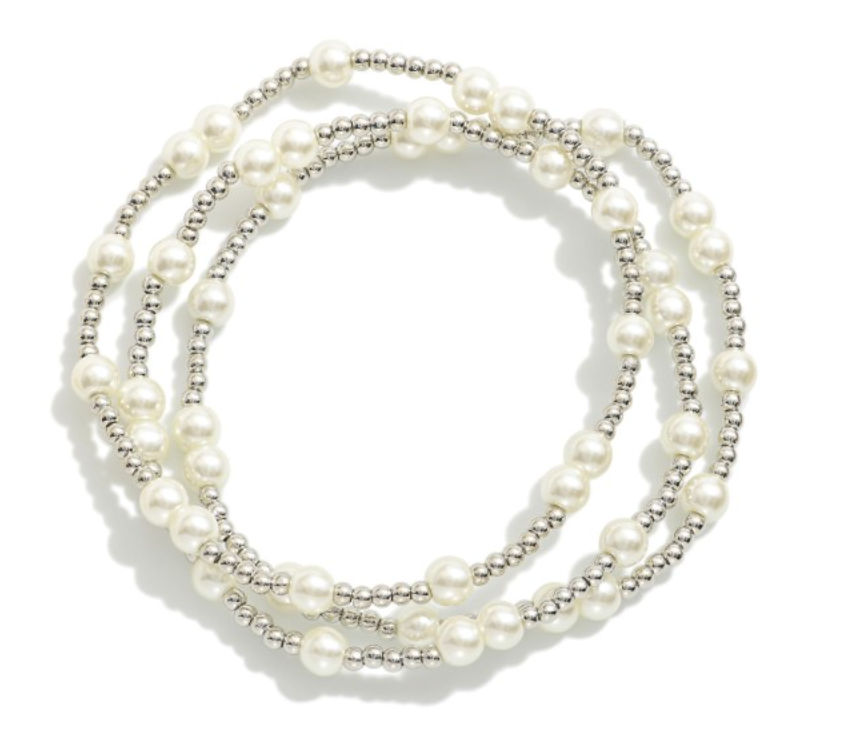 Set of Three Pearl Beaded Stretch Bracelets With Metal Bead Accents