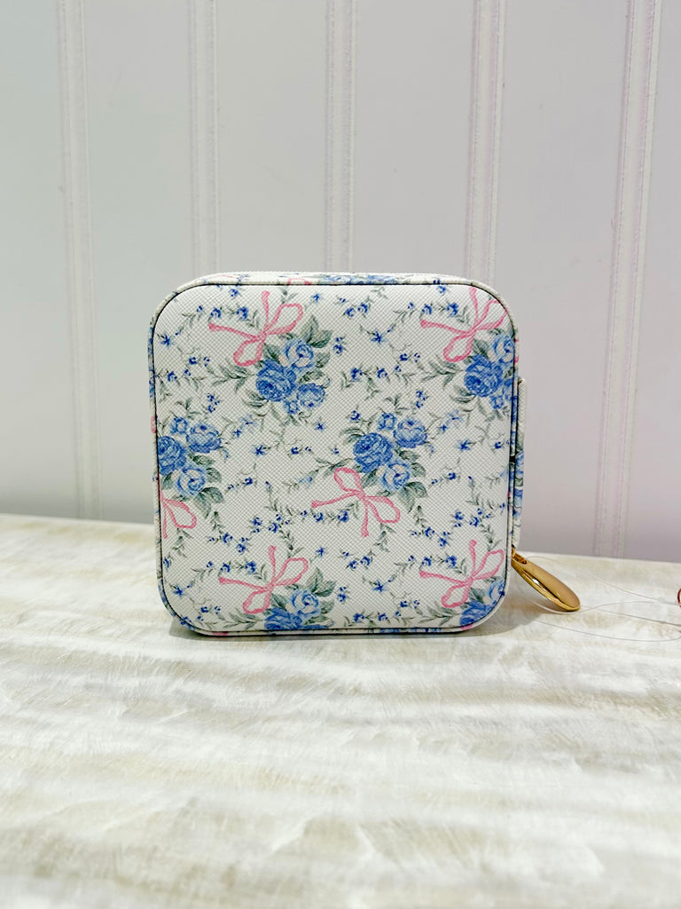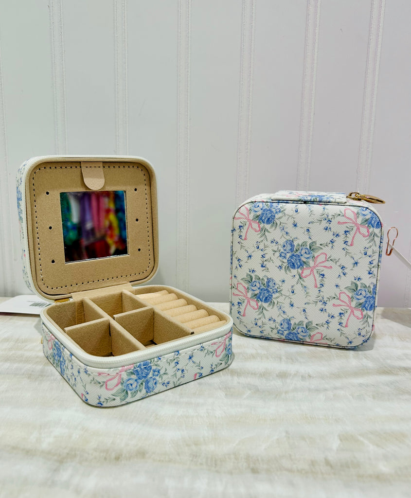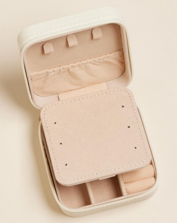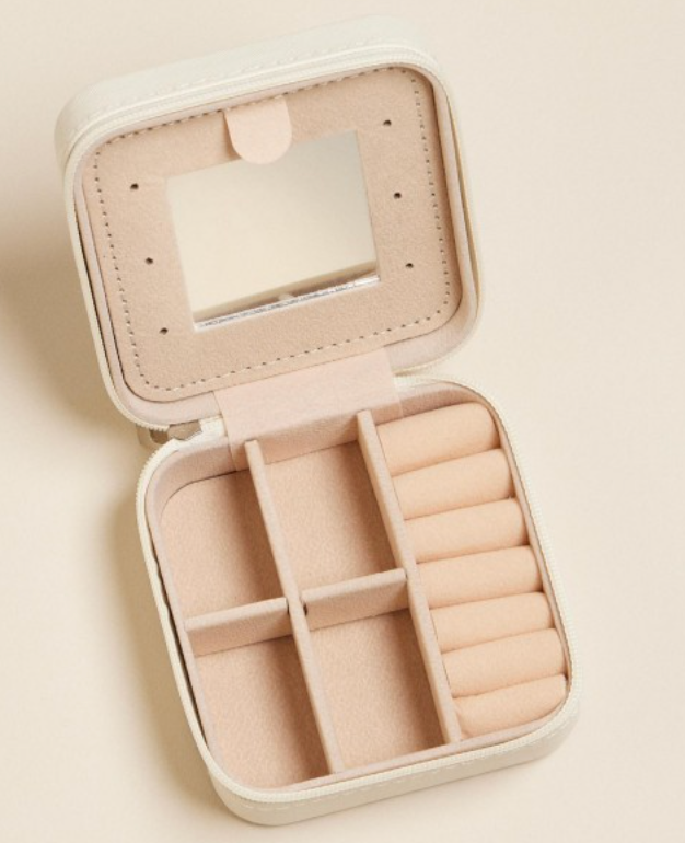- Full Zipper Closure - Mirror & Earring Holder Divider - Removable Divider Organizer - 6 Ring Slots & 3 Necklace Hooks - Approximately 3.5" L X 3.75" T X 2" D