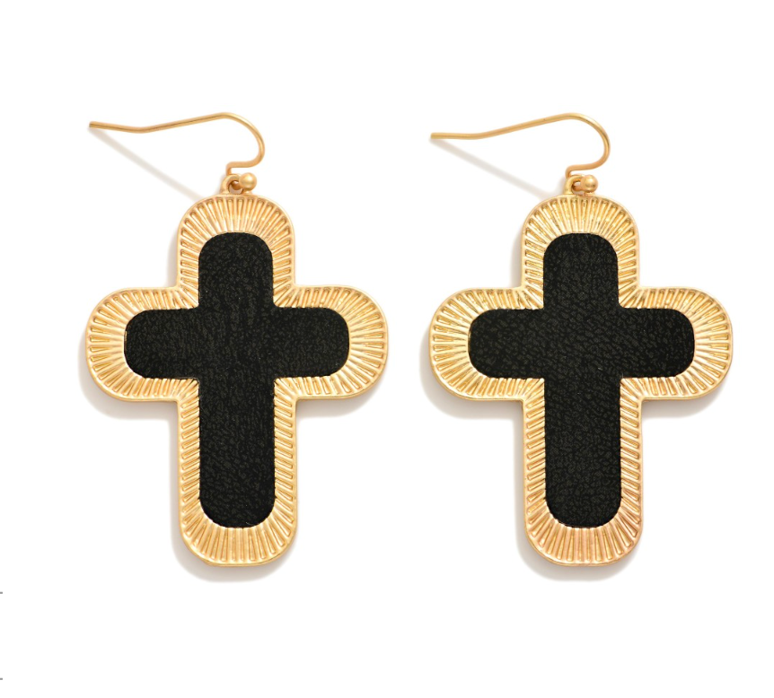 Vegan Leather Gold Tone Cross Shaped Drop Earring