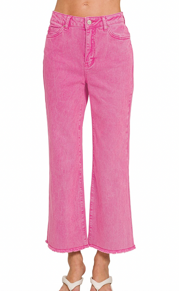 Add a touch of vintage flair with these hot pink acid washed high waist bootcut pants featuring a trendy frayed hem. Designed with good stretch for a comfortable and flattering fit, they’re the perfect mix of edgy and effortless style!