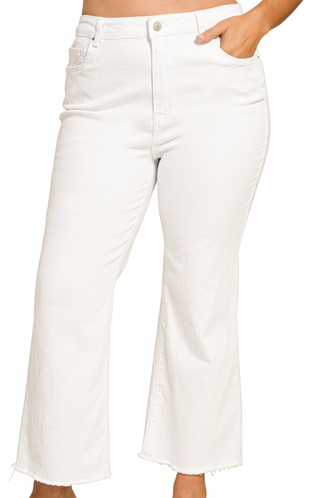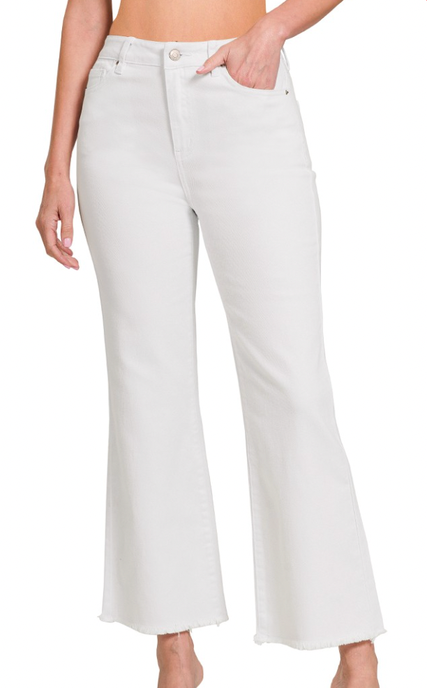Add a touch of vintage flair with these white acid washed high waist bootcut pants featuring a trendy frayed hem. Designed with good stretch for a comfortable and flattering fit, they’re the perfect mix of edgy and effortless style!