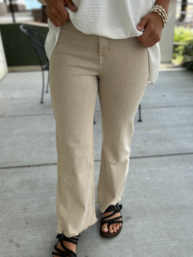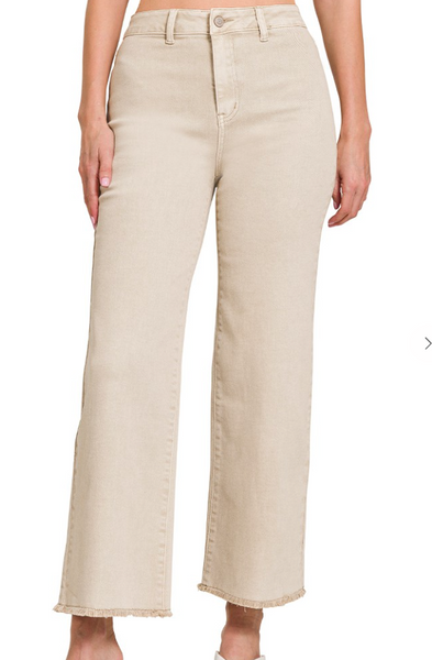 Cute and comfy acid-washed wide-leg pants with a frayed cutoff hem and great stretch. Perfect for a laid-back look!