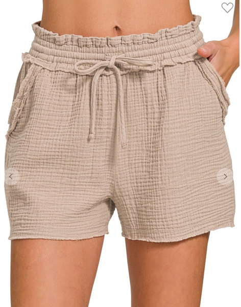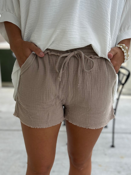 These cute mocha shorts feature a raw hemline, a double gauze fabric, and an adjustable drawstring. These shorts are perfect for the beach or even for running quick errands!!