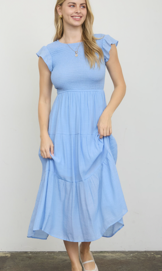 Classic with a girly twist. Round neckline, smocked body, and a tiered midi skirt for an effortlessly flattering fit. Lightweight, partially lined, and finished with a delicate button + keyhole closure in the back.