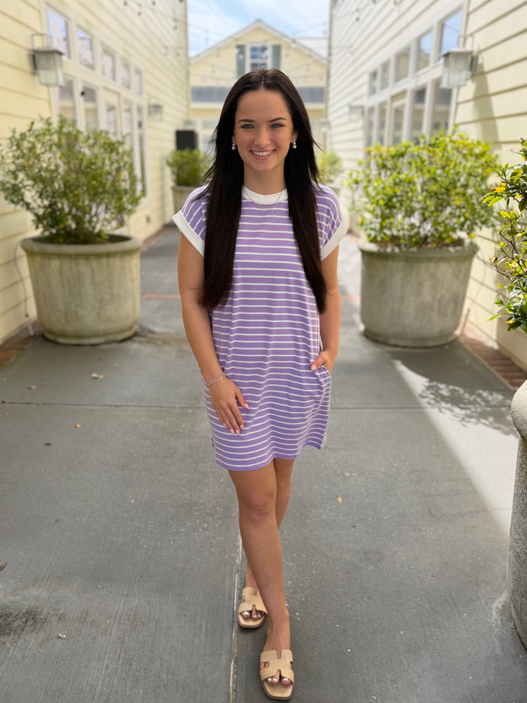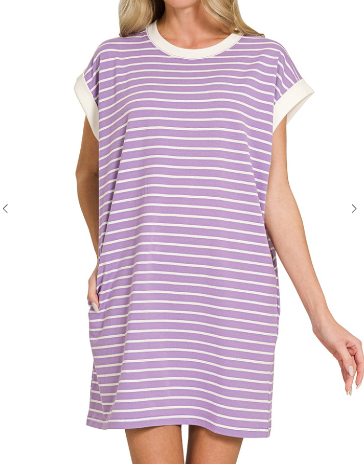 This comfy striped tee dress is relaxed, easy to wear, and has the cutest little pockets for all your essentials. The contrast trim adds a playful touch, making it perfect for everyday errands, coffee dates, or just lounging in style. Soft, breathable, and effortlessly chic—your closet’s new BFF!