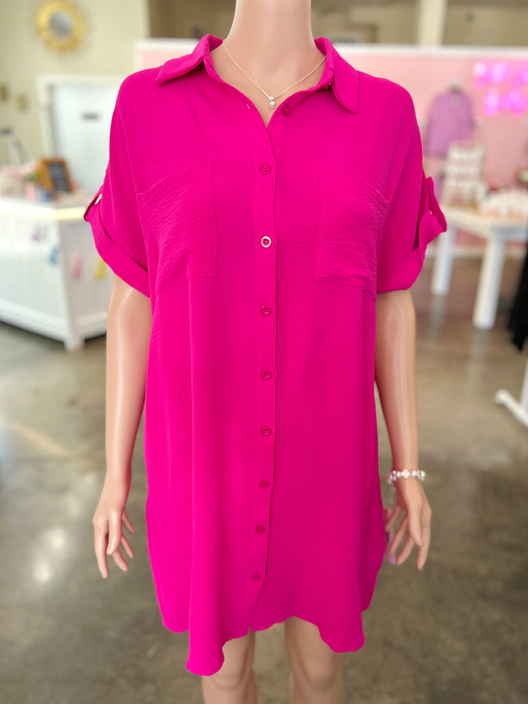 This pink drop shoulder button-up woven shirt dress is the perfect mix of comfy and cool! Featuring functional pockets and a relaxed fit, it's an easy grab-and-go look you can dress up or down. Layer it, belt it, or wear it loose—so many ways to style!
