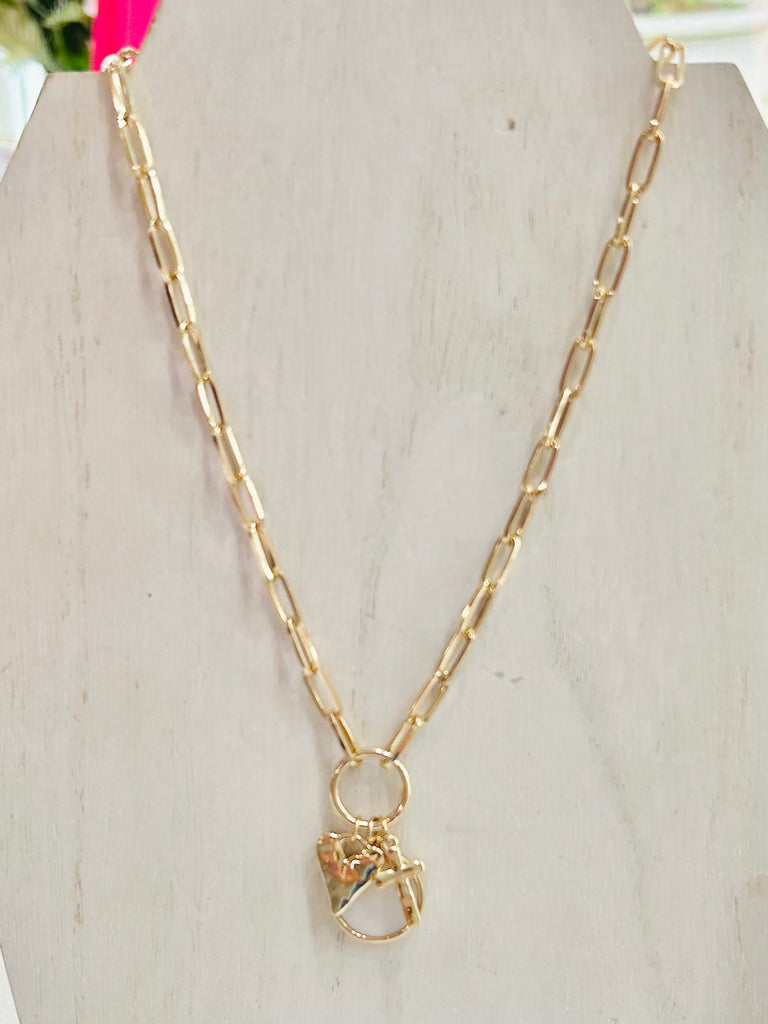 Paperclip Chain Link Necklace Featuring Metal Tone Hoop Pendant With Cross, Heart & Pearl Charms
