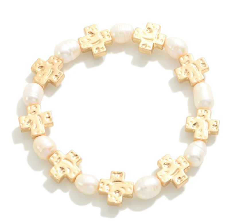 Dimpled Cross and Pearl Beaded Stretch Bracelet