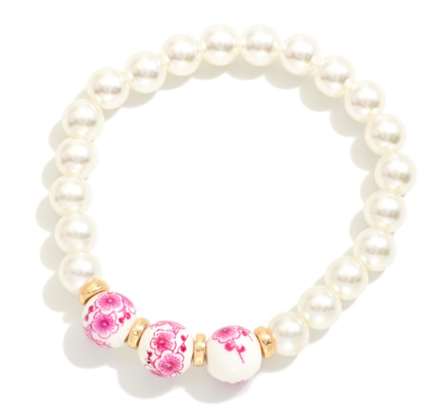 Pearl Beaded Stretch Bracelet Featuring Chinoiserie Bead Details