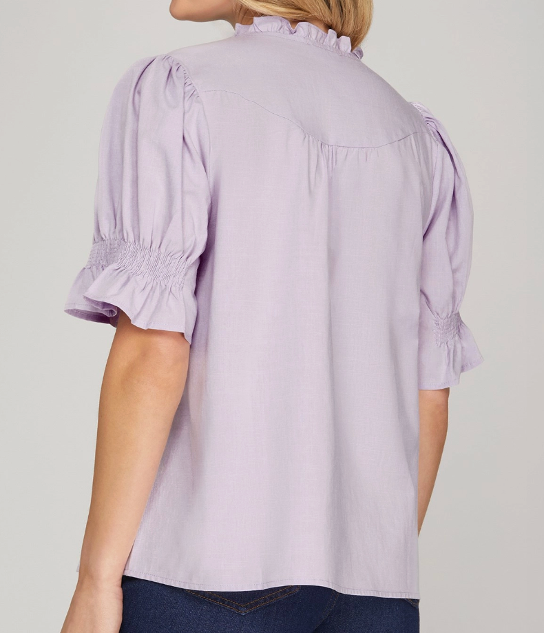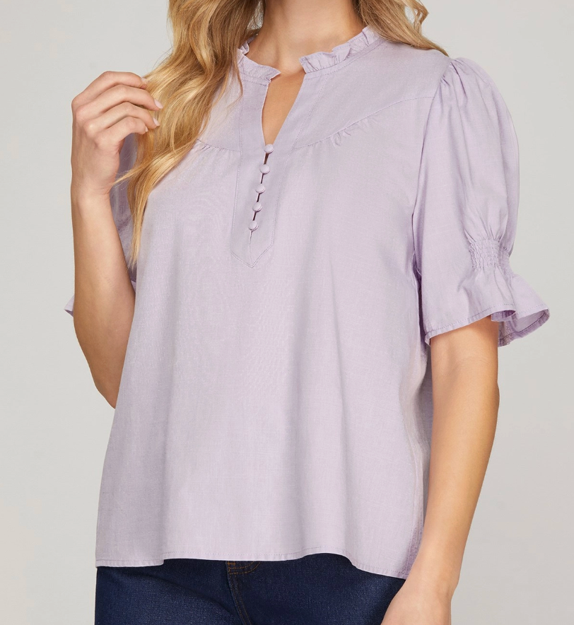 This easy, everyday top features short sleeves with smocked detailing for a sweet, feminine touch. Lightweight and comfortable with a relaxed fit, it’s perfect for casual days or dressing up with your favorite accessories. A versatile piece you’ll reach for again and again.