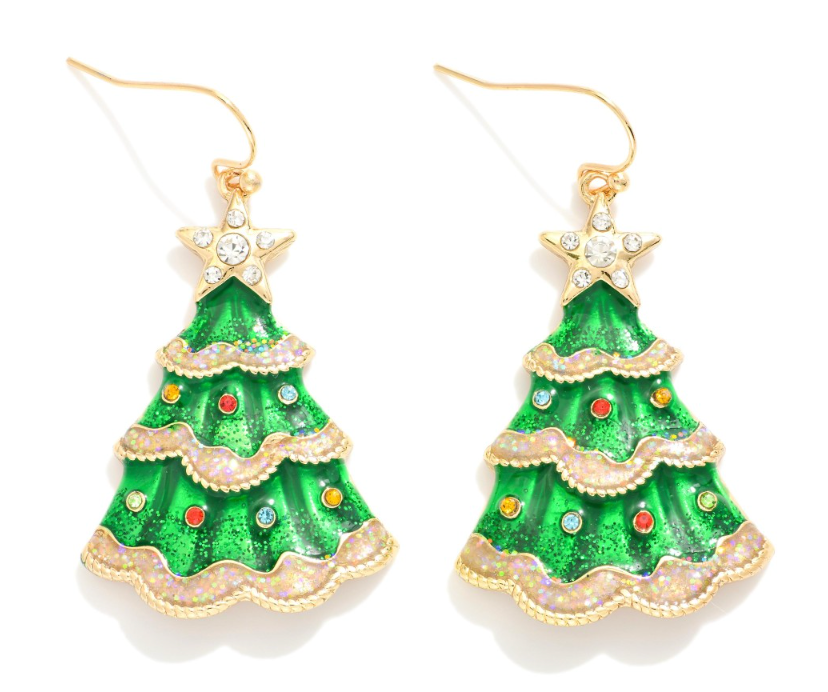 Enamel Christmas Tree Drop Earrings Featuring Glitter & Rhinestone Accents