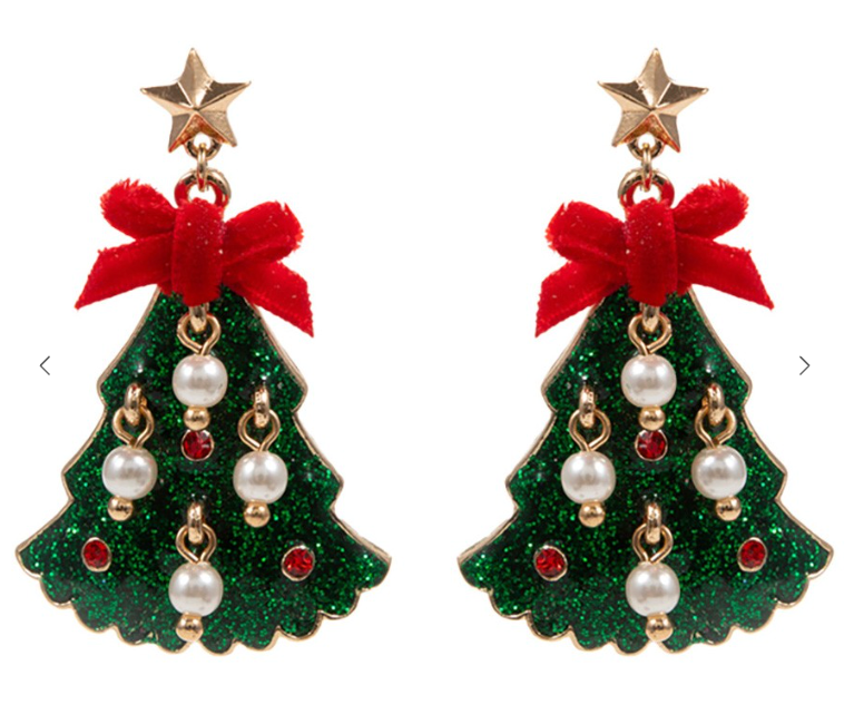 Green Glittered Enamel Christmas Tree Drop Earrings with Red Bow and Pearl Details
