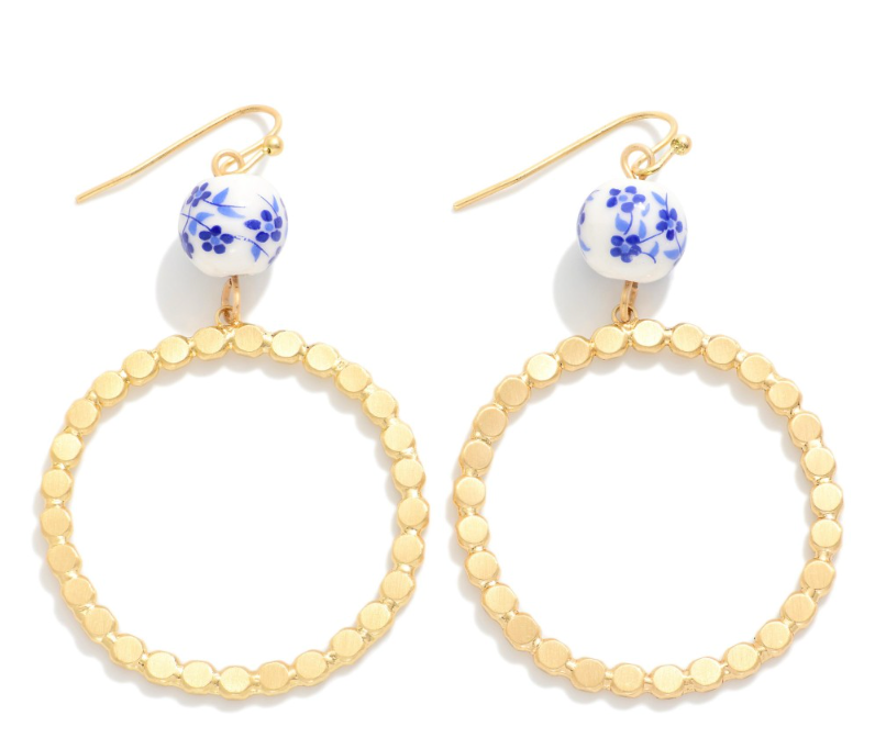 Linked Metal Tone Hoop Drop Earring Featuring Chinoiserie Flower Bead