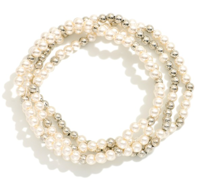 Set of Three Beaded Stretch Bracelets Featuring Metal Tones & Pearls