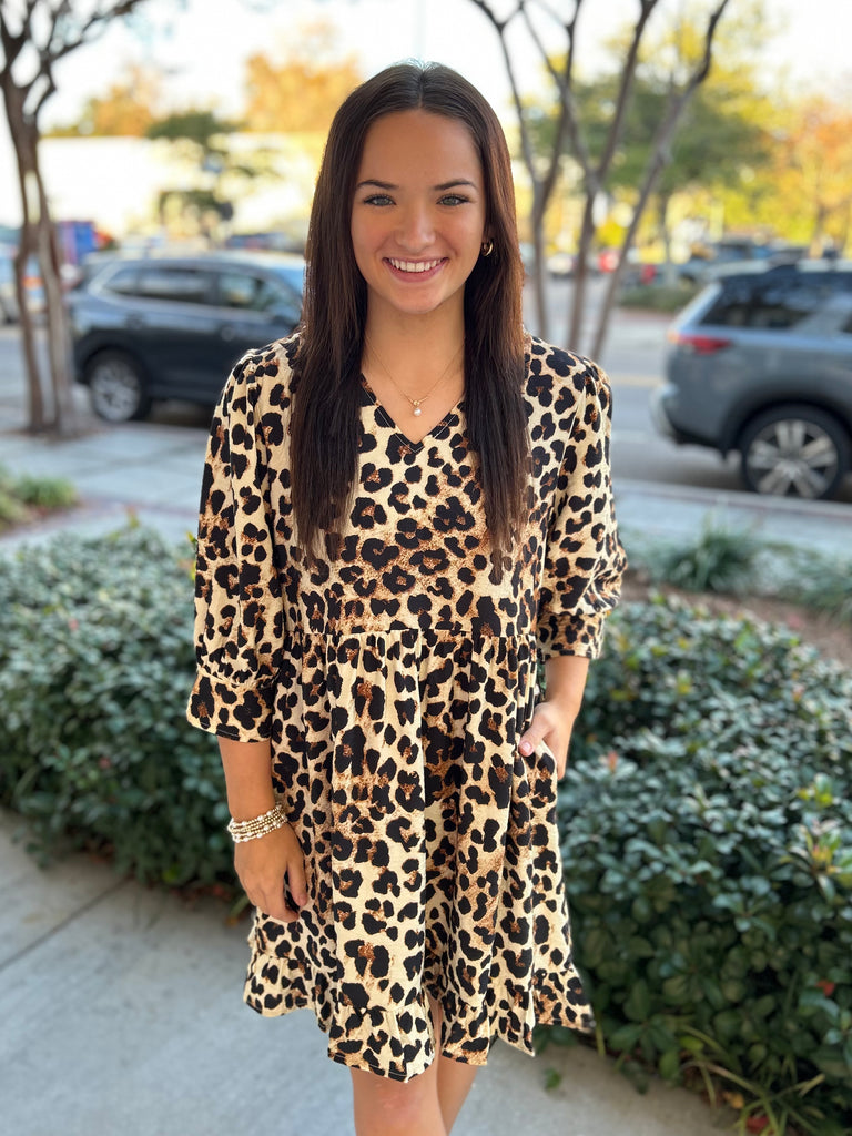 Turn heads in this playful Leopard Print Babydoll Dress, designed with a flattering V-neckline and charming puffed three-quarter sleeves with buttoned cuffs. The relaxed babydoll silhouette flows into a ruffly hemline for an effortlessly feminine finish. Fun, flirty, and easy to wear — this dress brings the perfect pop of print to any day!