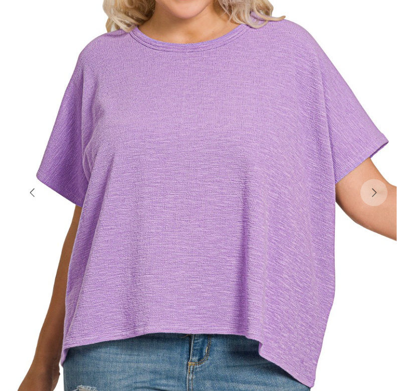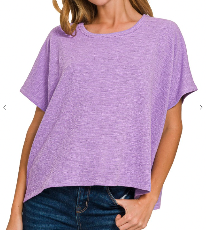 This lavender top is a casual, loose-fit tee with a cute pocket and relaxed sleeves, perfect for a laid-back look.
