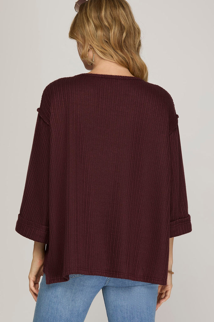 This maroon knit top features a round neckline, 3/4 sleeves with a folded cuff, and a side slit with a longer length in the back! It's perfect for layering or wearing solo—your new go-to for dressing up or down during the fall! Made of 100% polyester.