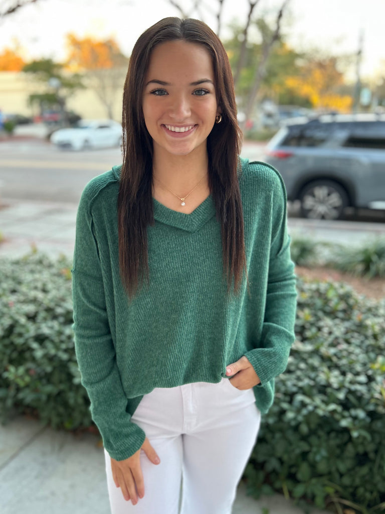 Wrap yourself in cozy texture with this green ribbed hacci v-neck sweater. The drop-shoulder fit creates an easy, relaxed vibe, while the hi-low hem and side slits give it that perfect flattering drape. Finished with exposed seam detailing for a touch of casual edge, this soft and lightweight knit is an everyday essential you’ll reach for again and again!