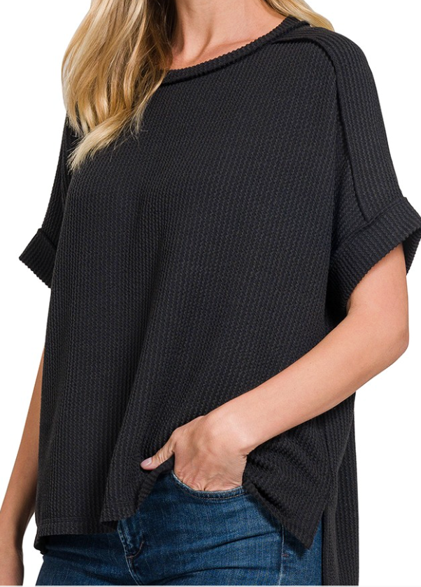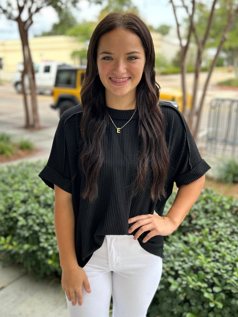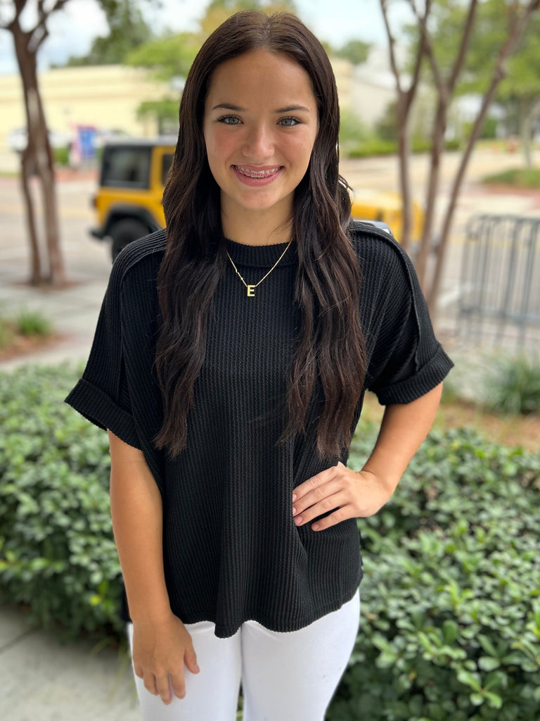 This adorable black top features ribbed cuff sleeves, a cozy fit, and raw edge details, making it a must-have for your cute and girly wardrobe!