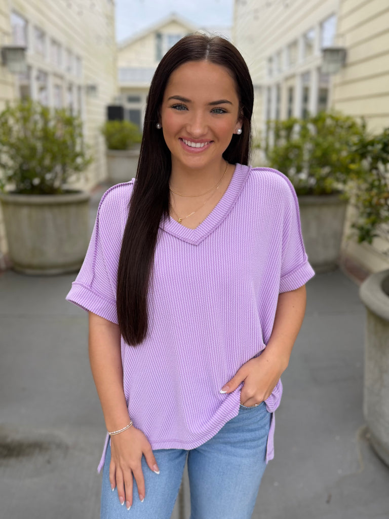 This lavender top offers a unique ribbed texture that stands out. The relaxed fit provides all-day comfort and an effortlessly stylish look. With its hi-low hem and flattering V-neck, this top is perfect for casual outings or dressing up for a night out!