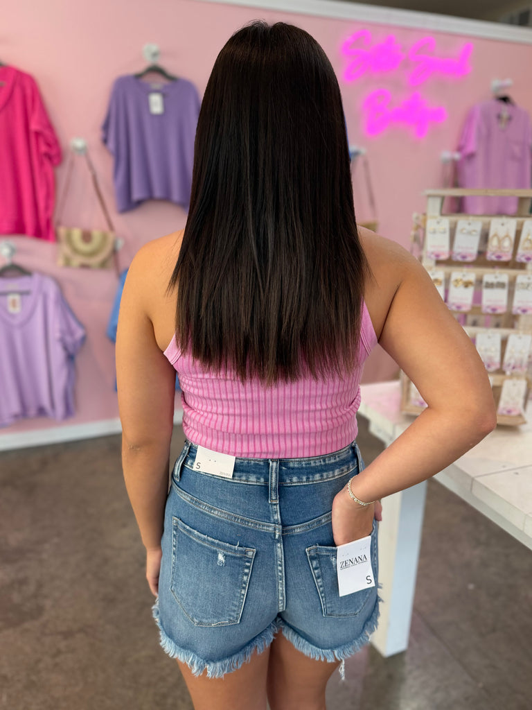 These mid-rise denim shorts feature a flattering fit with soft stretch fabric for all-day comfort. Designed with a raw frayed hem and laid-back vibe, they’re the perfect go-to for effortless, everyday style.