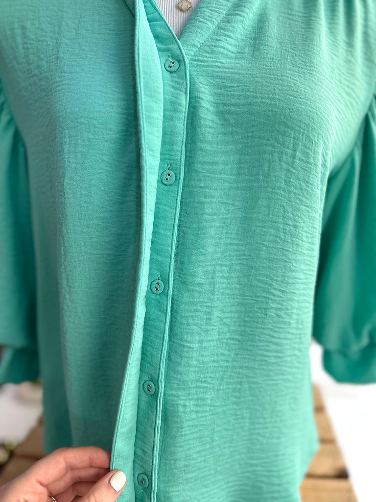This charming emerald/mint blouse features 3/4 length gathered balloon sleeves, covered functioning buttons down the front, and a rounded back yoke for a soft, feminine silhouette. Lightweight and breezy, it’s perfect for dressing up or keeping casual.