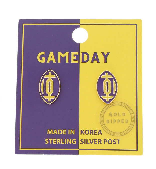 Purple/Yellow game day enamel football stud earrings in white and yellow gold plating with sterling silver posts