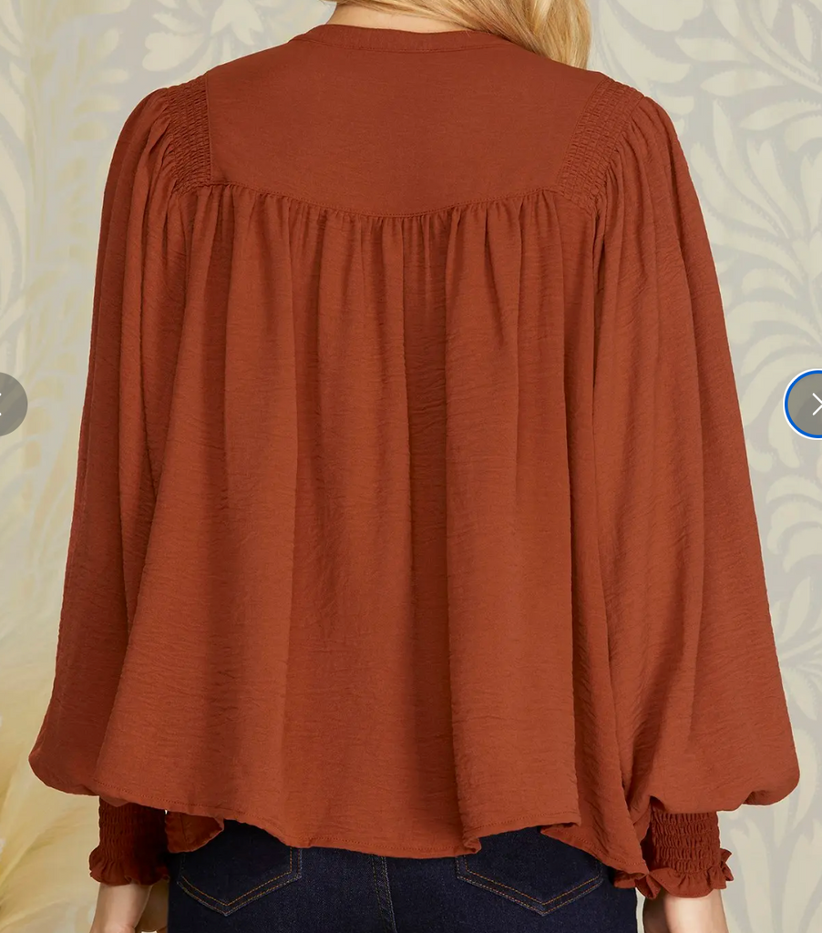 A fall favorite! This rust woven long sleeve top features charming smocked details and a classic button-up front. Made of 100% polyester for a lightweight, effortless look.