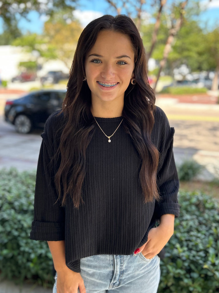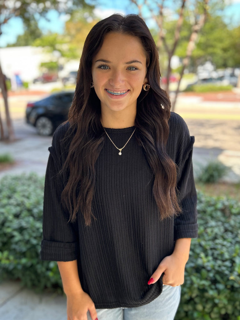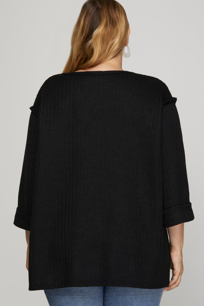 This black knit top features a round neckline, 3/4 sleeves with a folded cuff, and a side slit with a longer length in the back! It's perfect for layering or wearing solo—your new go-to for dressing up or down during the fall! Made of 100% polyester.