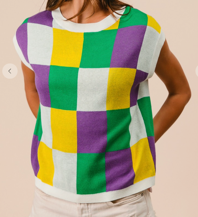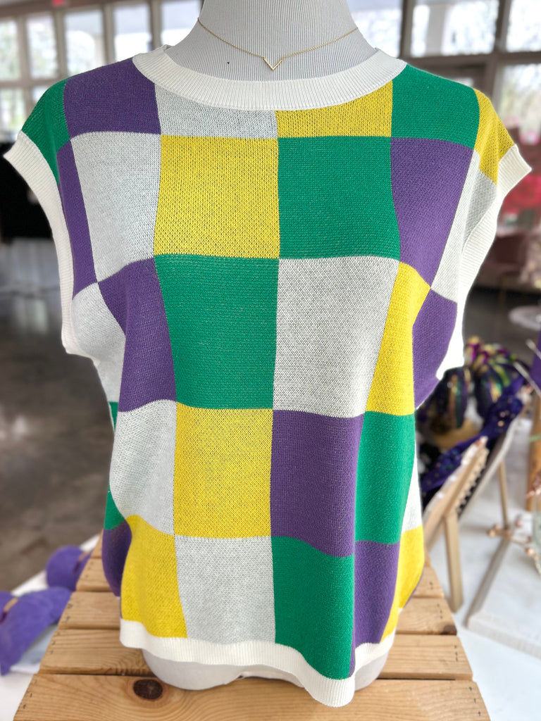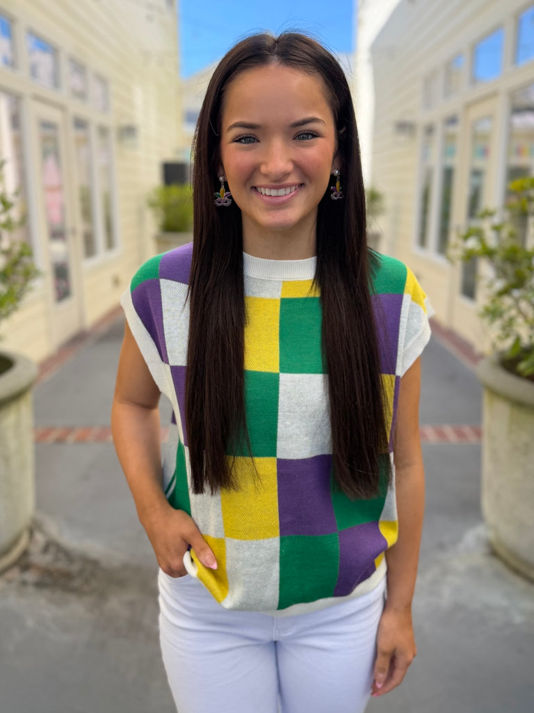 Celebrate in style with our City of Celebration Sweater Vest! Featuring a bold checker design inspired by festive Mardi Gras colors, this sleeveless piece is the perfect mix of fun and fashionable. Lightweight and comfy with a flattering fit, it’s easy to dress up or down for parades or parties. Made of an acrylic/cotton blend.