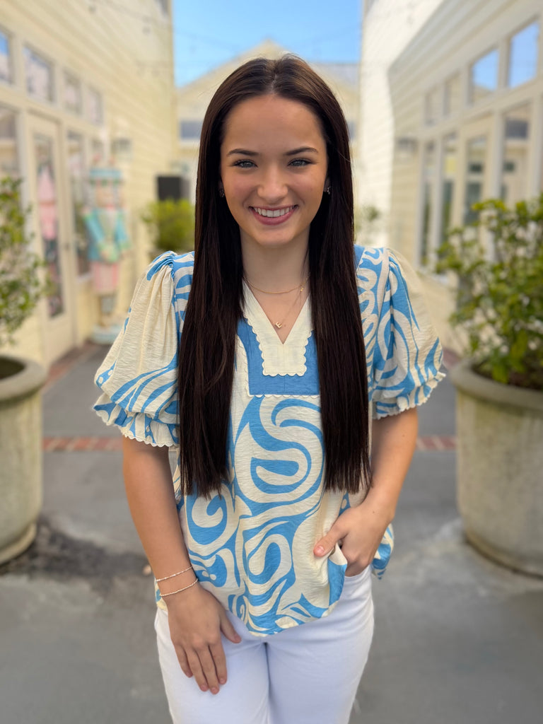 This adorable blue blouse features a charming print with a flattering V-neckline, short gathered balloon sleeves, and whimsical ric-rac trim details for a sweet, feminine touch. Lightweight and easy to style.
