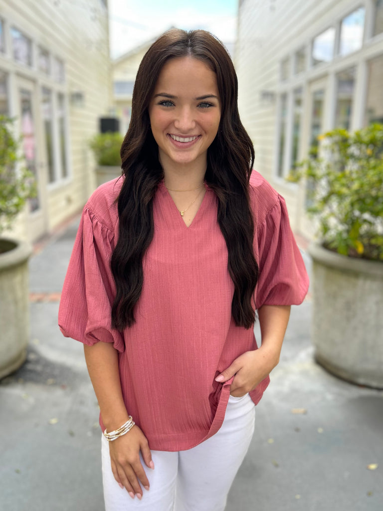 This textured rose puff sleeve blouse features a flattering split V-neck and airy 3/4 puff sleeves for an effortless, feminine look. Designed with a relaxed, boxy silhouette, it offers comfortable wear with just the right amount of structure. Lightweight and unlined, it’s an easy piece to style for everyday or dressed-up moments!