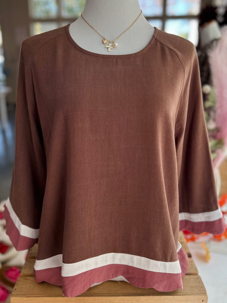 Add a touch of autumn charm with this linen color block top, featuring a classic round neckline, 3/4 sleeves, and a scalloped hem with contrasting trim. Lightweight and easy to layer (not lined), it’s the perfect piece to carry you through crisp fall days!