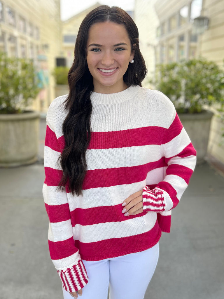 It's love at first sight with this cozy striped sweater. The alternating pink and white stripes and boxy fit makes it a must have for everyone! Made of 100% cotton.