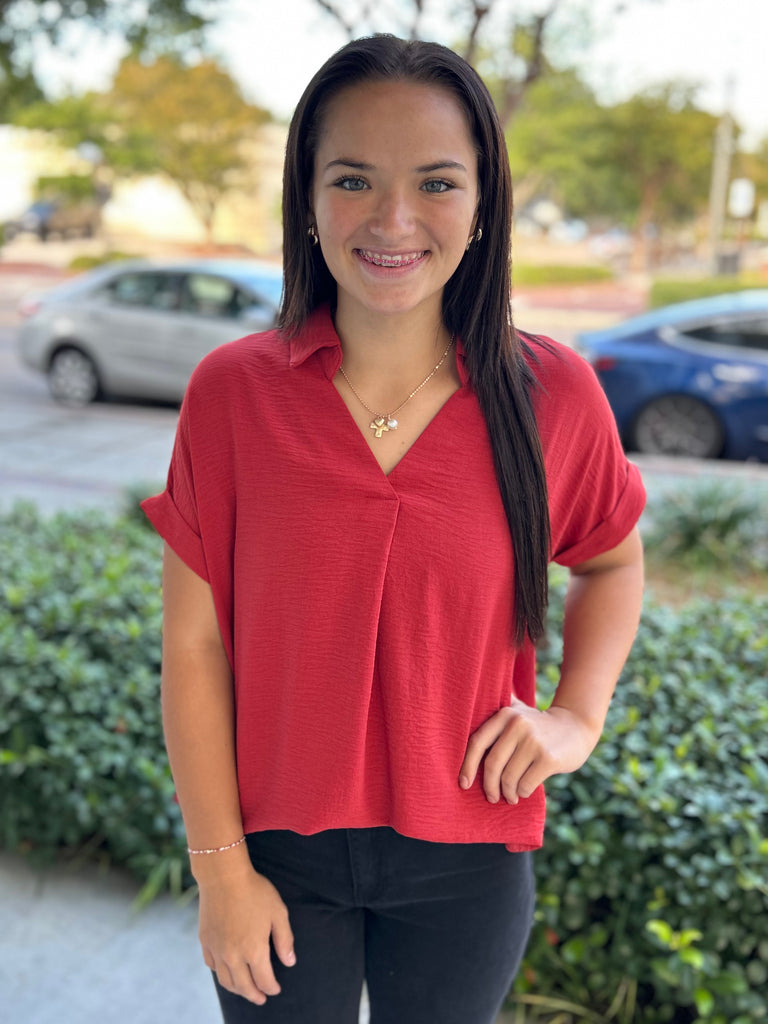 Meet your new go-to! This rust drop shoulder collared woven top is effortlessly chic and comfy for any occasion. Made of 100% polyester.