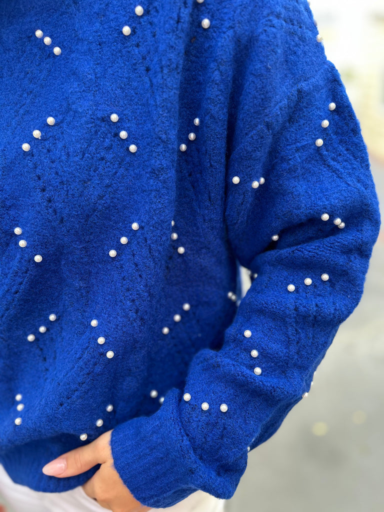 Feel as pretty as a pearl in this royal blue crew neck sweater. This soft sweater features sleeves with ribbed cuffs and pearls embellishing the diamond patterned knit.