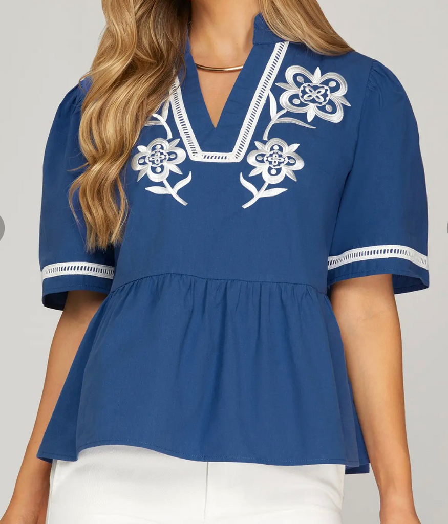 This beautiful woven top features a flattering V neckline with delicate floral embroidery and soft lace detailing for an elevated, feminine touch. Designed with half sleeves and a lightweight feel, it’s perfect for both casual days and dressier moments.