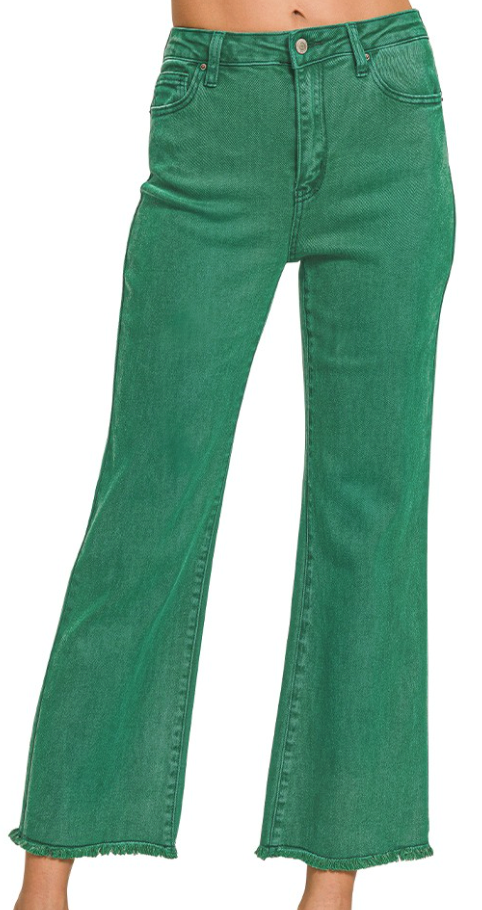 Add a touch of vintage flair with these green acid washed high waist bootcut pants featuring a trendy frayed hem. Designed with good stretch for a comfortable and flattering fit, they’re the perfect mix of edgy and effortless style!
