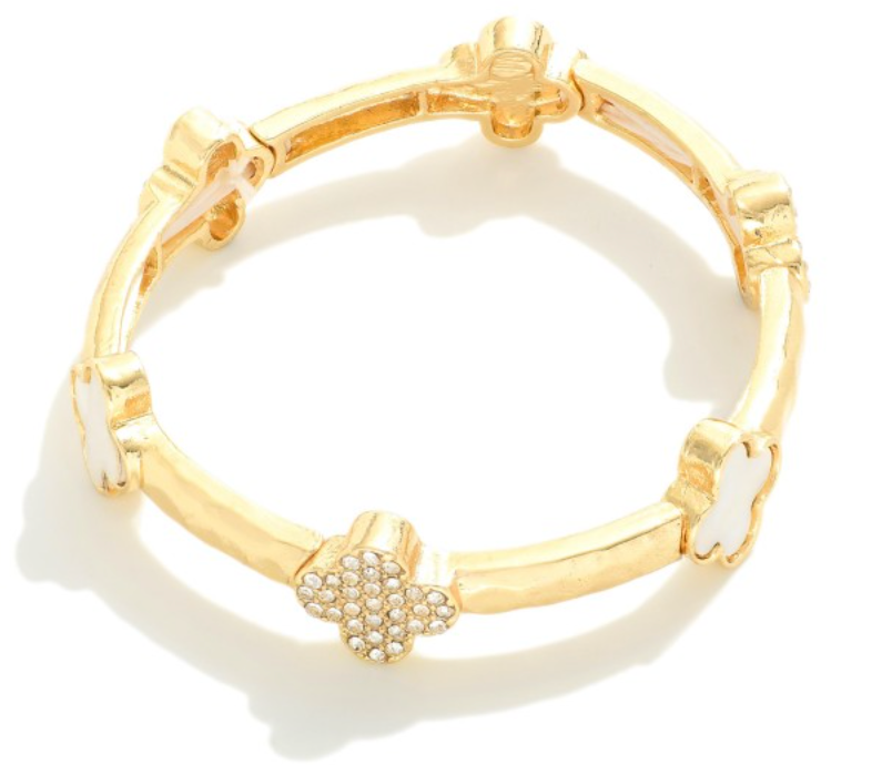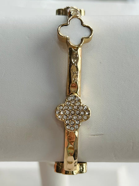 Bangle with Rhinestone & White Clovers - Gold