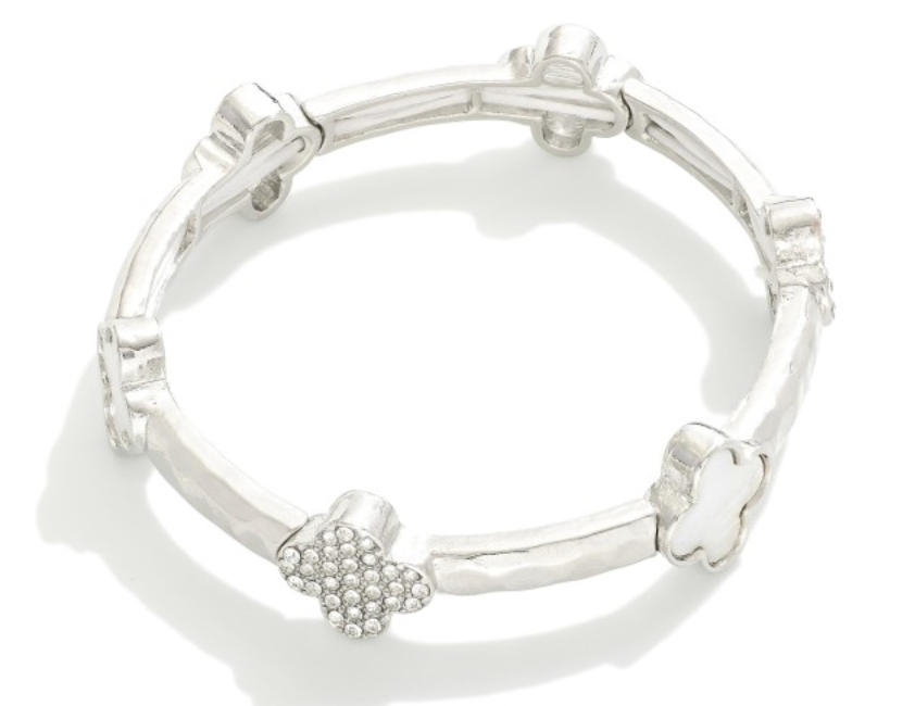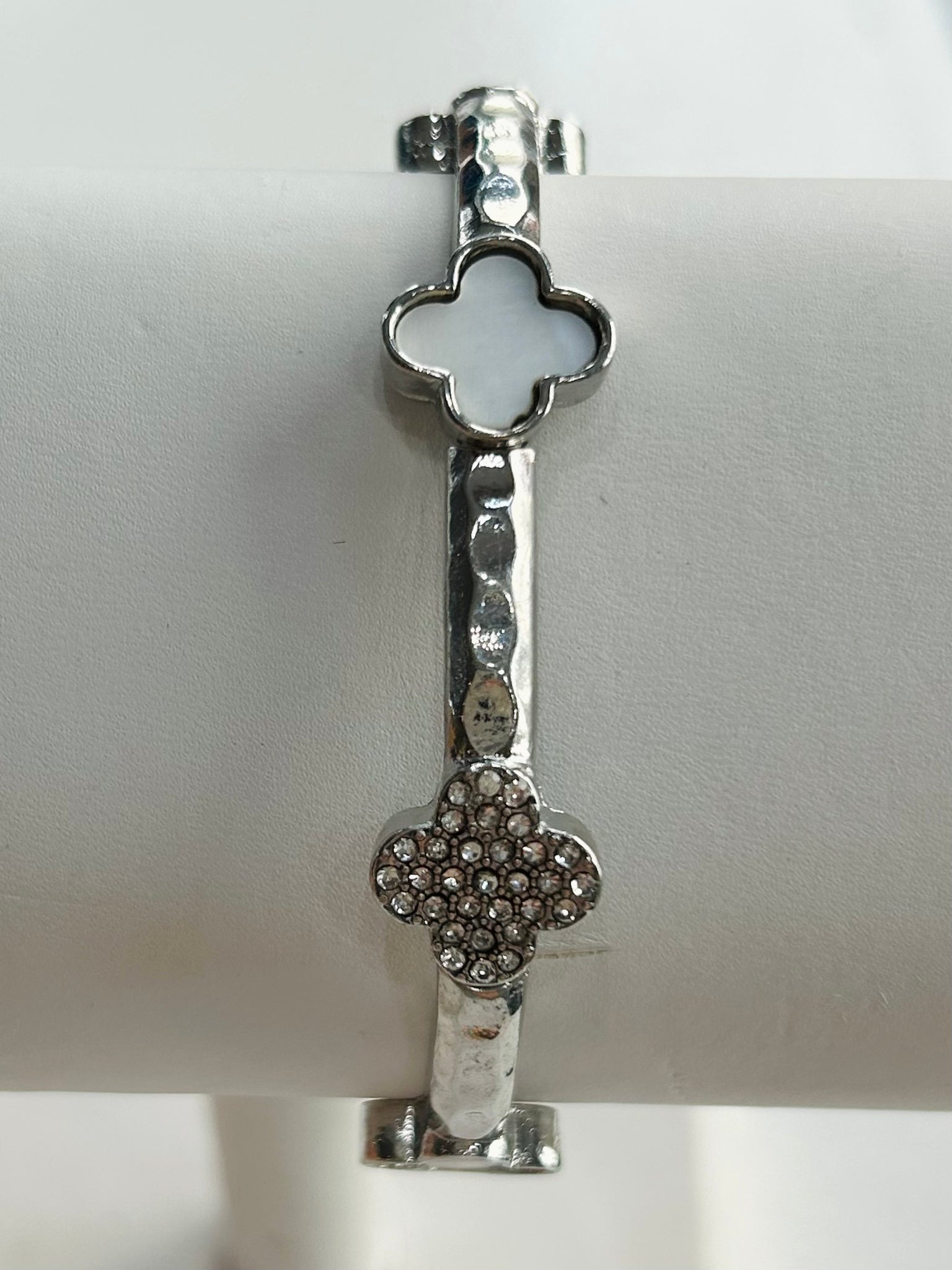 Bangle with Rhinestone & White Clovers - Silver