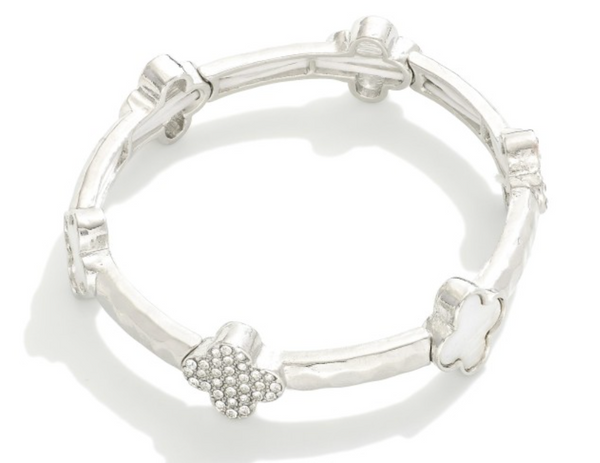 Hammered Metal Stretch Bracelet Featuring Pave Rhinestone & Pearl Clovers