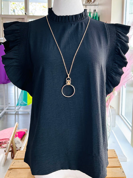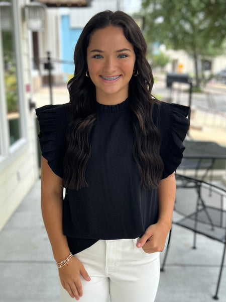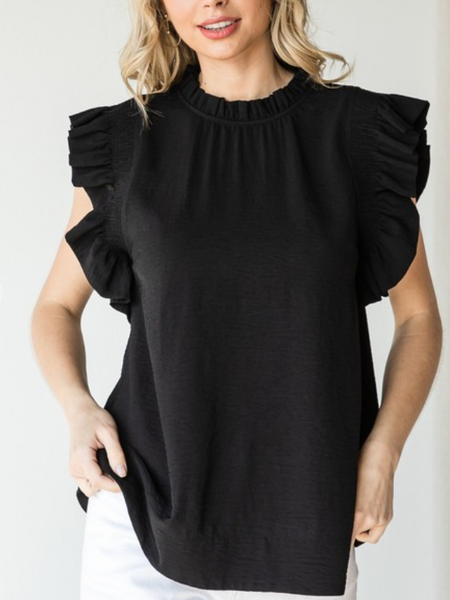 Be the moment in this solid black blouse with a frill mock neckline, smocked ruffle cap sleeves, and a back keyhole detail. Made of 100% polyester.