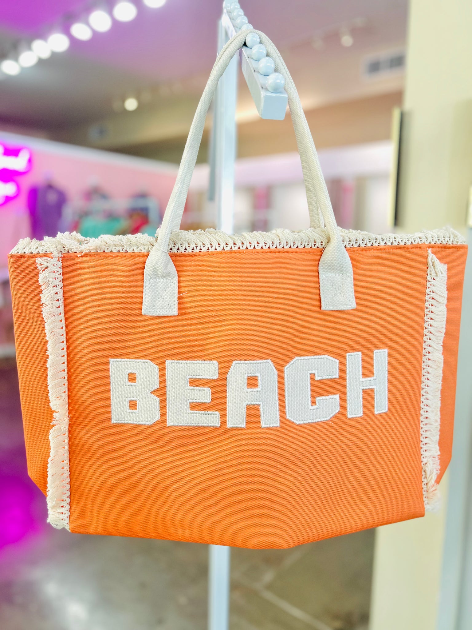 Adorable Blue Canvas Tote Bag With "BEACH" Embroidered Canvas Patches Featuring Fringes Accents