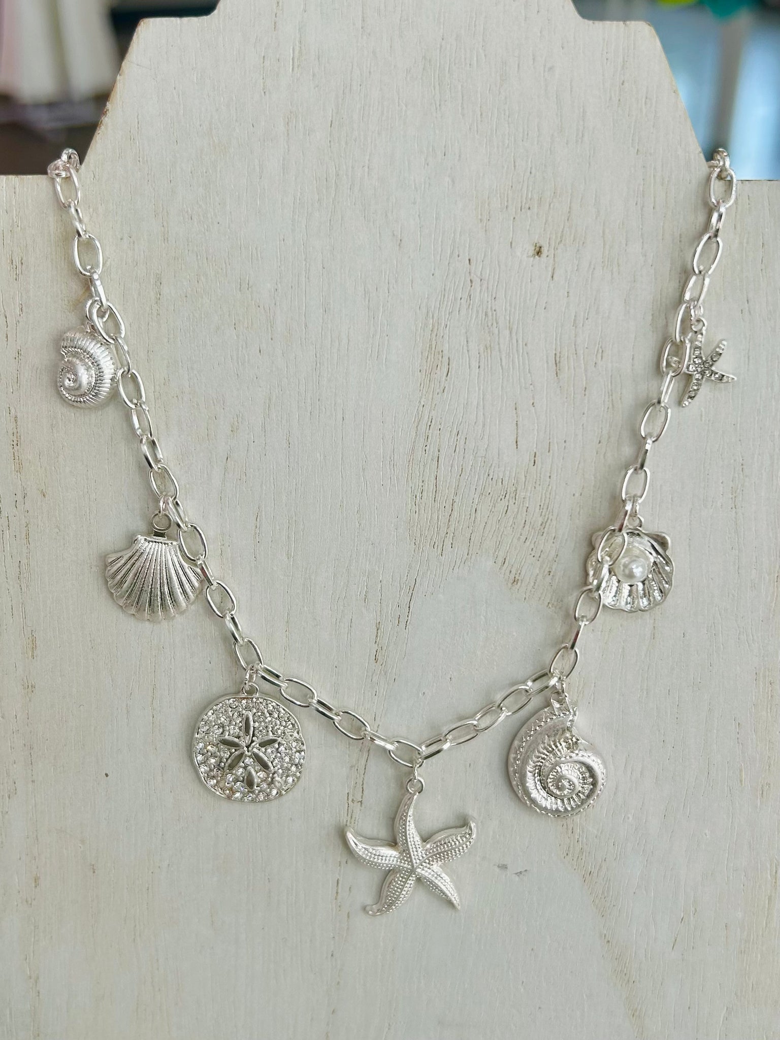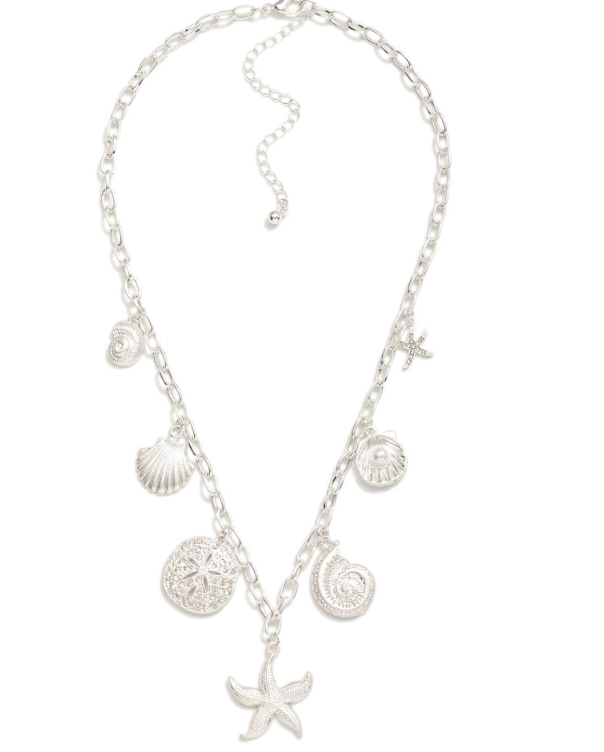 Chain Link Charm Necklace Featuring Metal Tone, Rhinestones, & Beach Charms