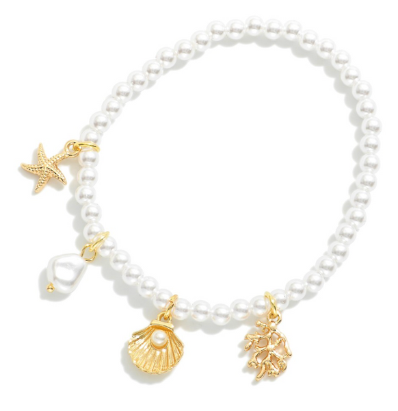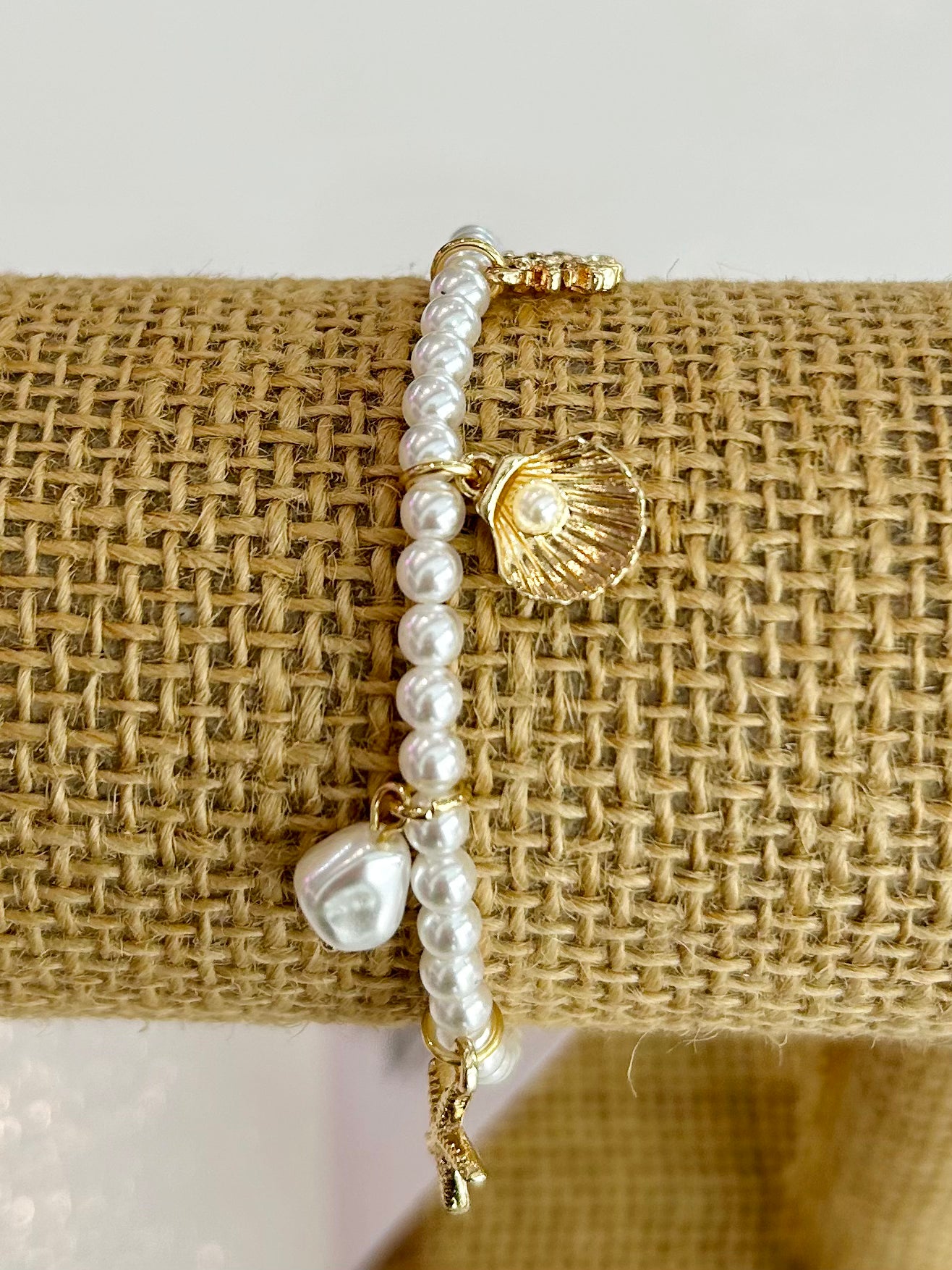 Pearl Beaded Stretch Beach Bracelet Featuring Shell, Coral Reef, Starfish, and Pearl Charms