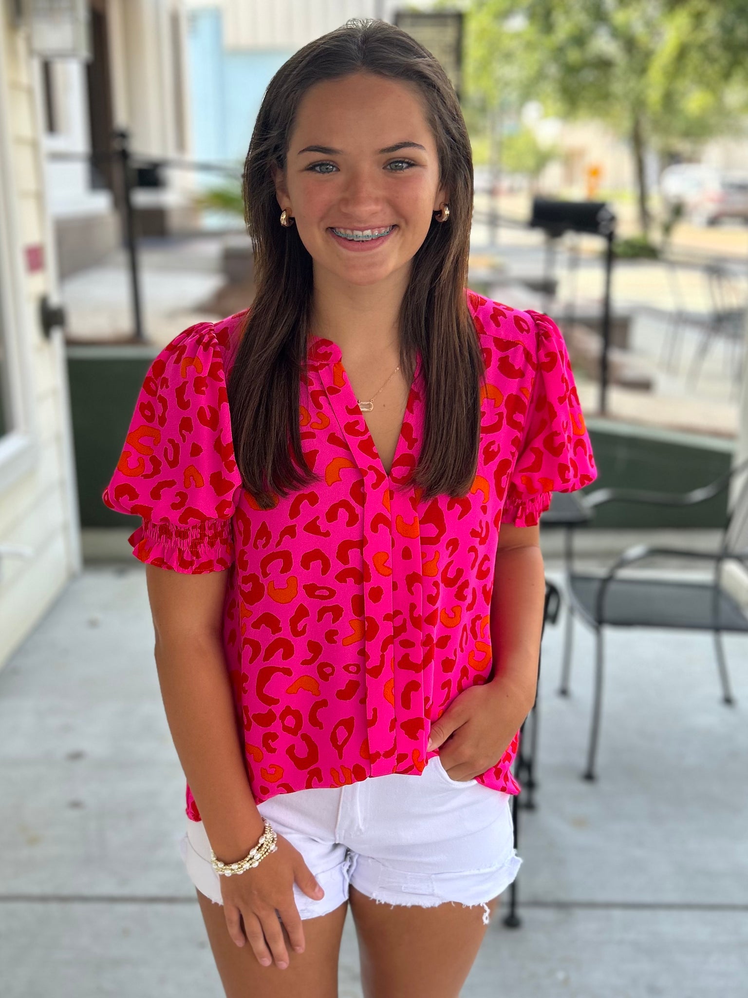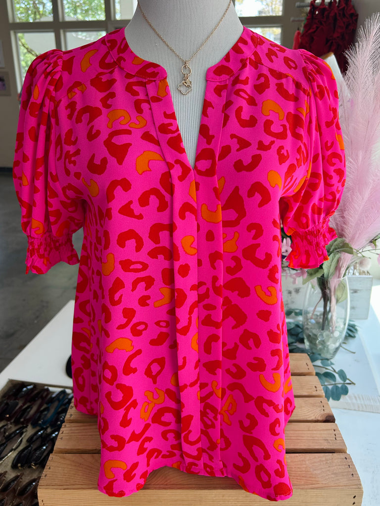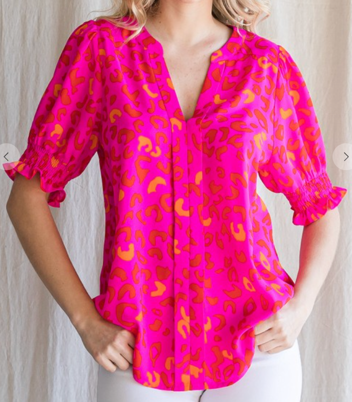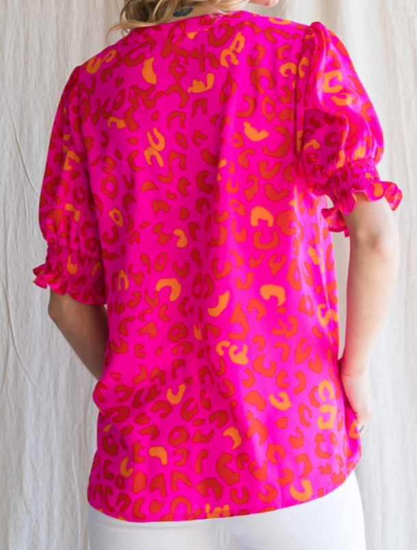 We are in love with this pink leopard print blouse with a split neckline and short bubble sleeves with smocked cuffs. Made of 100% polyester.