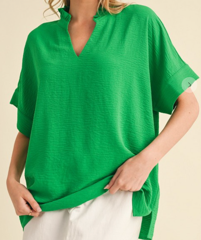 Simple yet sweet! This solid green blouse features a frilled V-neck, breezy dolman sleeves, and banded cuffs for an effortlessly chic look. Made of polyester/spandex blend.