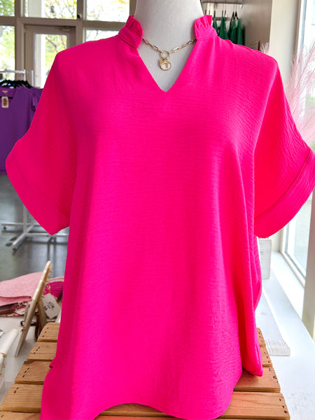 Simple yet sweet! This solid pink blouse features a frilled V-neck, breezy dolman sleeves, and banded cuffs for an effortlessly chic look. Made of polyester/spandex blend.