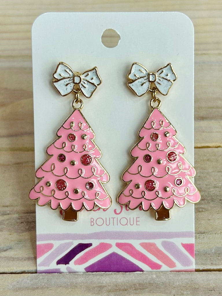 Enamel Christmas Tree Earrings With Metal Bow Post Drop Featuring Glitter And Rhinestone Accents